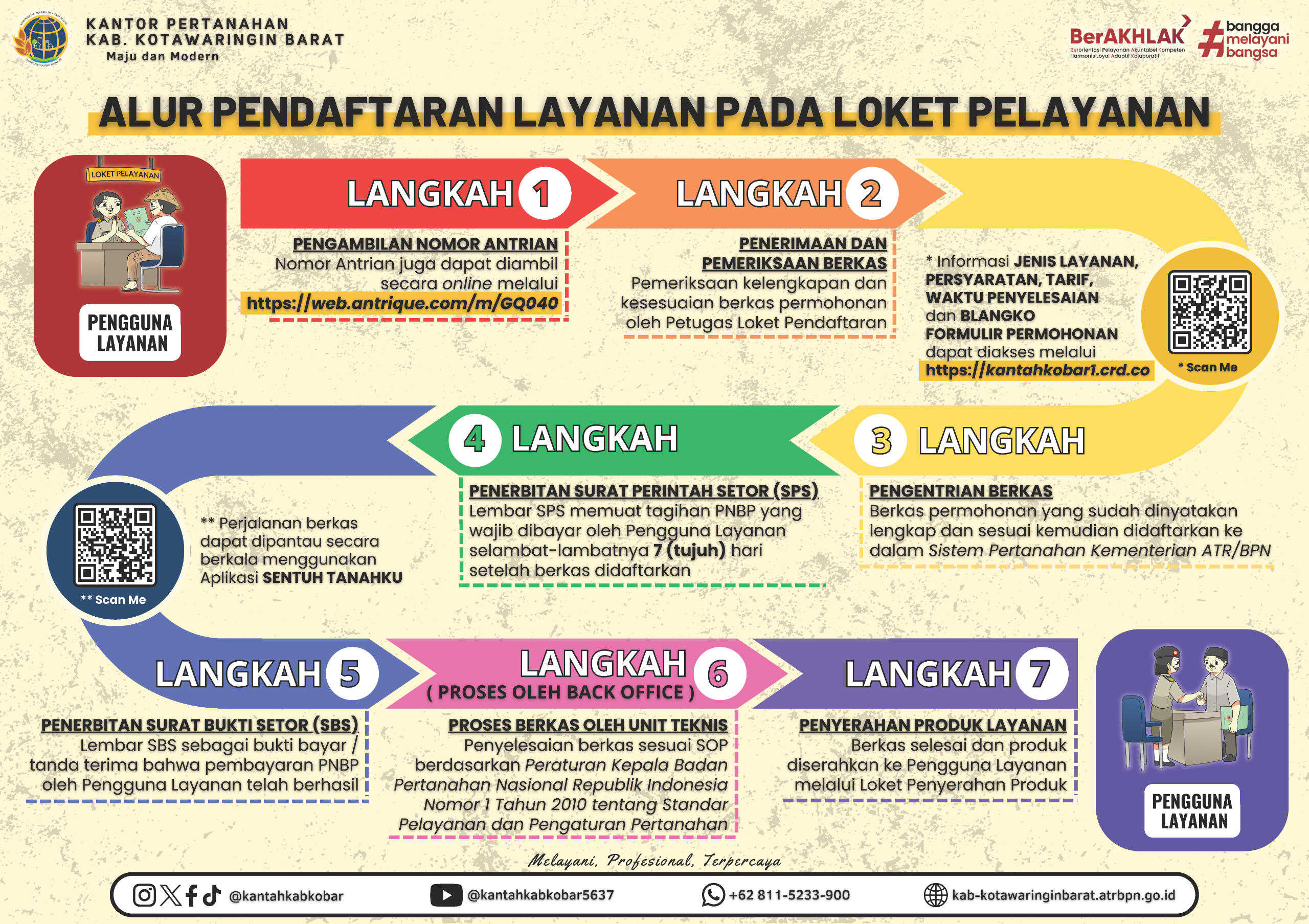 Cari tahu informasi tentang JENIS LAYANAN, PERSYARATAN, TARIF dan WAKTU PENYELESAIAN pada laman berikut.Kelengkapan persyaratan permohonan yang berupa fotokopi agar disahkan/dilegalisasi oleh Pejabat yang berwenang, atau Pemohon membawa dokumen asli untuk dicocokan oleh Petugas pada saat mendaftar.Berdasarkan Lampiran II Peraturan Kepala Badan Pertanahan Nasional Republik Indonesia Nomor 1 Tahun 2010, setiap formulir surat permohonan yang sudah diisi dan ditandatangani pemohon atau kuasanya agar dibubuhi di atasnya dengan materai cukup.